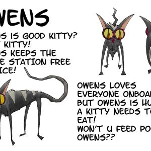Owens is the resident housecat on a space station floating in deep space - a companion, pest control specialist, and informal mascot for the crew, and one of the few bright spots in their otherwise bleak lives. Owens has adapted to life in space with relatively little trouble, and loves playing in zero gravity! Loves belly rubs, but watch out!