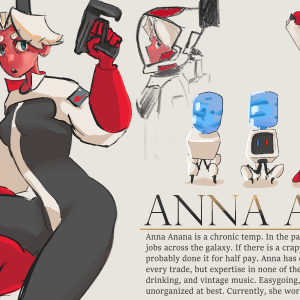 Anna Anana is a chronic temp. In the past year, she has worked nearly 20 different jobs across the galaxy. If there is a crappy job you can think of, she has probably done it for half pay. Anna has entry level experience in nearly every trade, but expertise in none. She has interests in eating, drinking, and vintage music. Easygoing, but unenthusiastic and disinterested at best. Currently, she works at Corp. Corp. as a grunt.